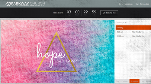 Join us to worship online with Parkway Church. Our services stream live at 9:30 AM and 11:00 AM on Sundays.